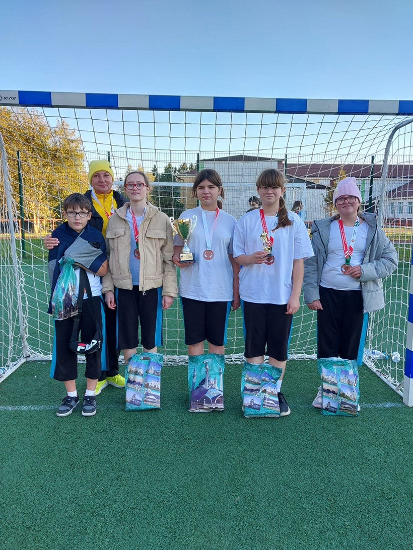 Команда девушек «Медведица» завоевала почетное 3 место. Кузьмина Мария награждена статуэткой-лучший игрок! В родную школу ребята вернулись с медалями и кубком Победы по футболу слепых. Поздравляем юных футболистов и тренера по адаптивной физической культуре Дарищеву О.Б. с победой и желаем дальнейших успехов на соревнованиях!